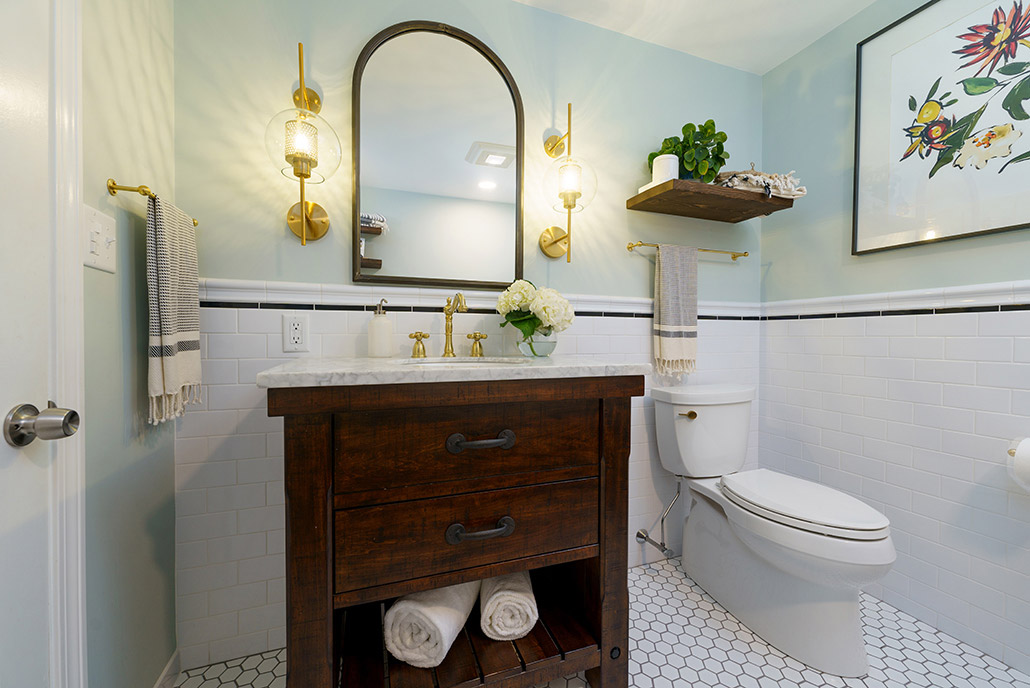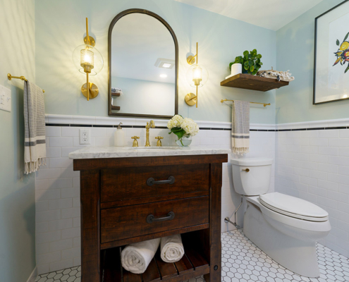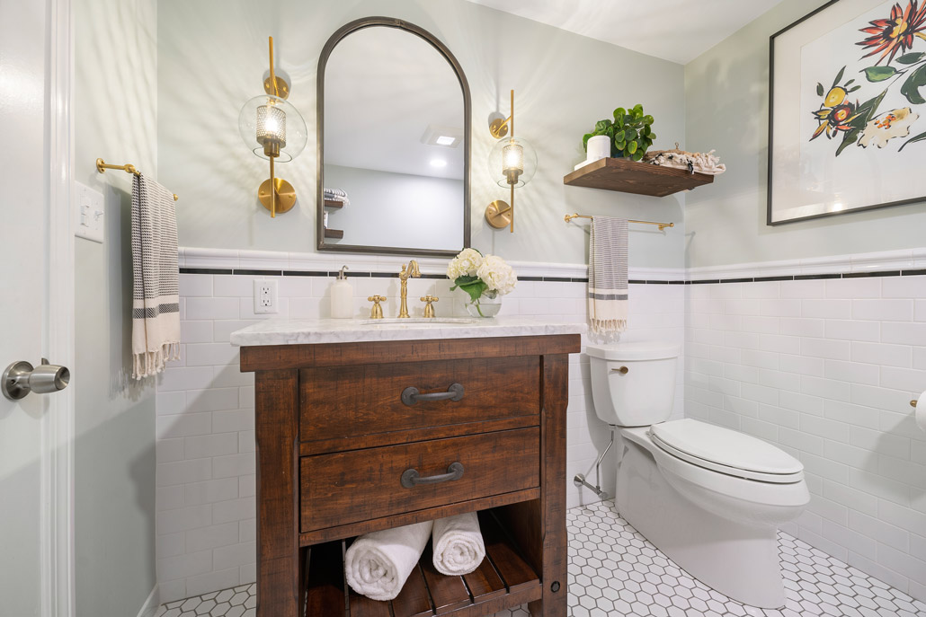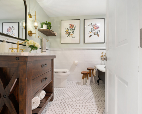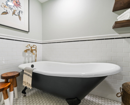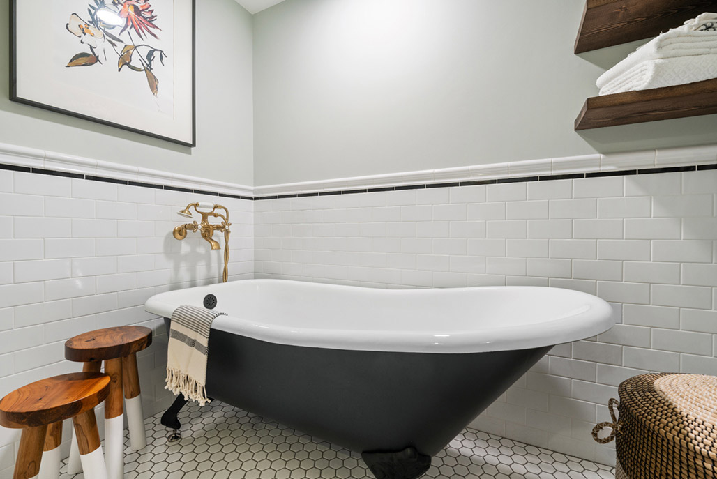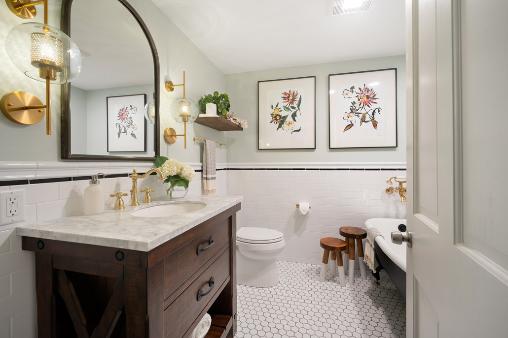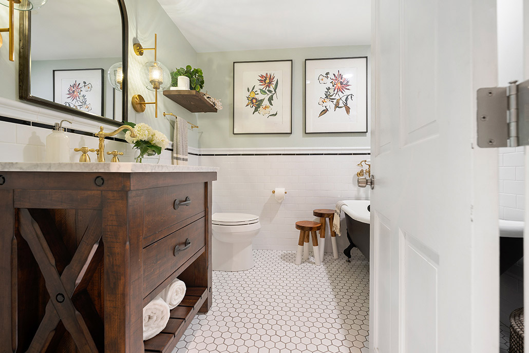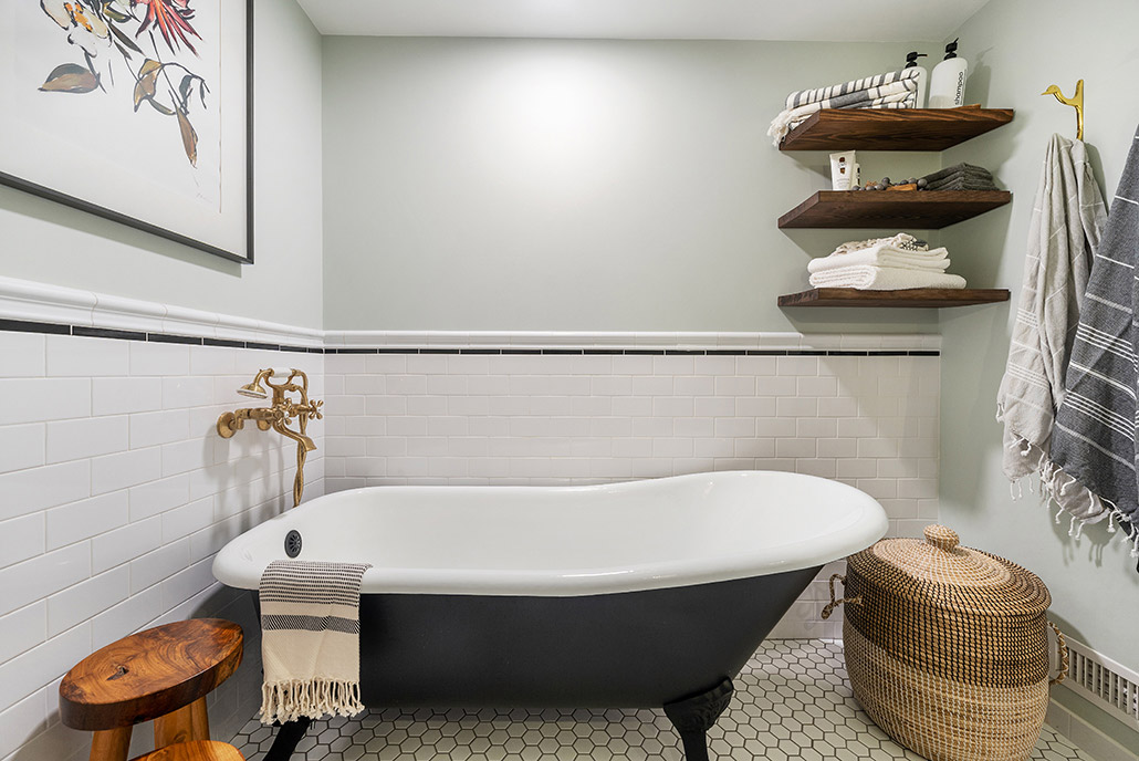This family-friendly bathroom remodel features a luxurious black clawfoot tub from Pottery Barn and traditional tile details. Brushed brass faucets add elegance, while Etsy-sourced hardware adds a unique touch, blending classic charm and personalized flair.