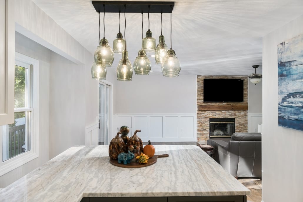 This homeowner wanted a bold, cool, kitchen that reflected her personality while allowing her to entertain her large family. This cramped, outdated space was transformed it into the heart of the home. Two islands, natural stone countertops and a cool appliance package allowed this space to go to drab to fab!